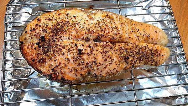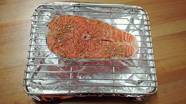 鮭魚洗淨擦乾 兩面都抹上海鹽 灑上義式香料