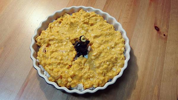 先煮好白飯 把白飯和南瓜濃湯放入烤盤中